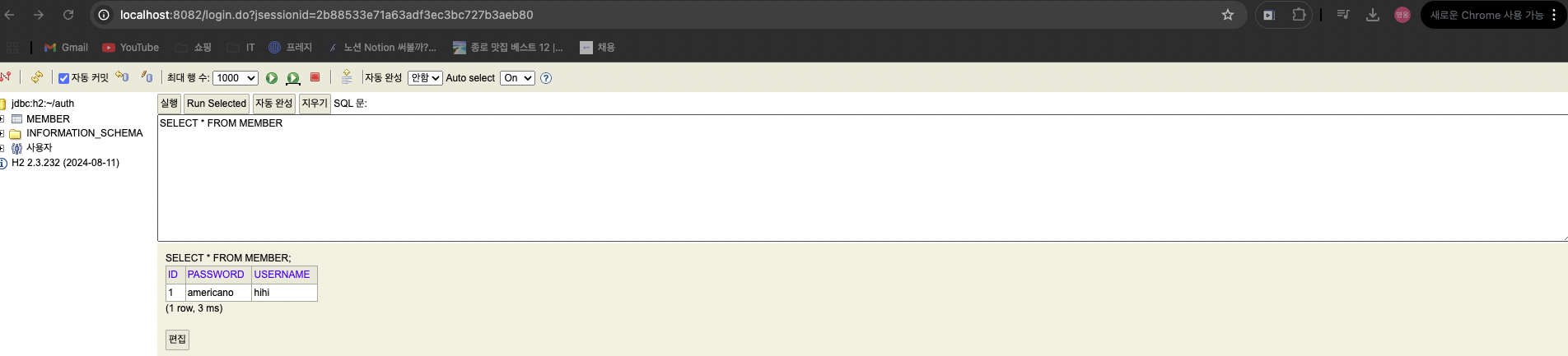 만약 h2를 설치하기를 원하지 않으신다면 yml datasource의 url를 jdbc:h2:mem:test로 변경하시면 됩니다.