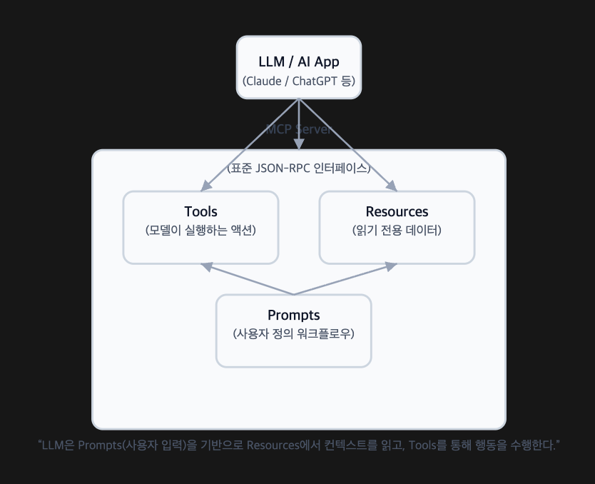“Prompts가 워크플로우를 시작하고, Resources에서 컨텍스트를 수집하며, Tools를 통해 행동을 수행한다.”