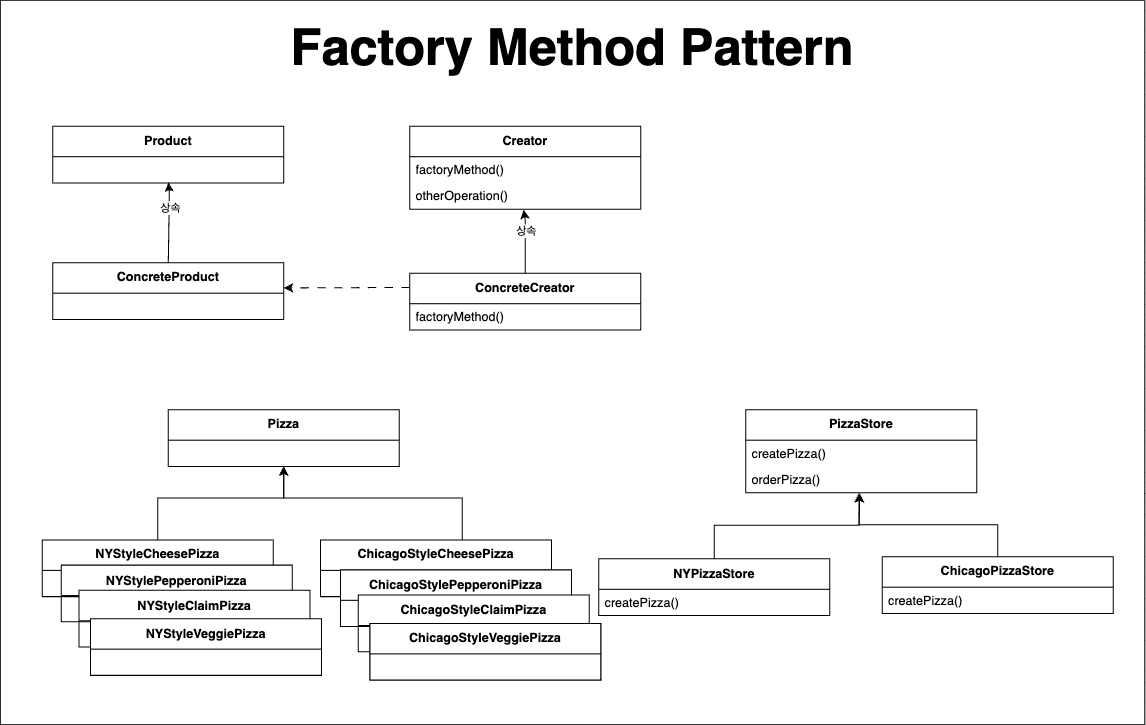 - 팩토리 메서드 패턴은 서브클래스(NYPizzaStore, ChicagoPizzaStore)에서 어떤 클래스를 만들지 정하므로, 객체 생성을 캡슐화