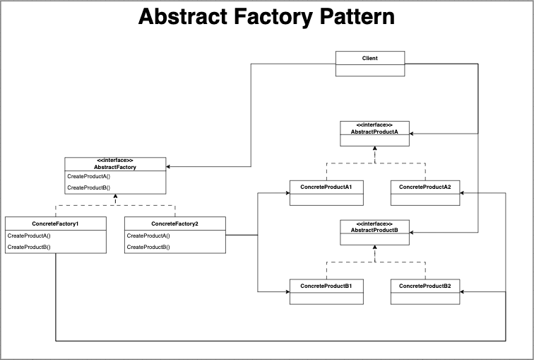 💡 구상 클래스에 의존하지 않고도 서로 연관되거나 의존적인 객체로 이루어진 제품군을 생산하는 인터페이스 제공.