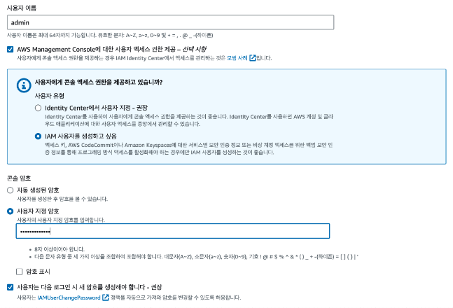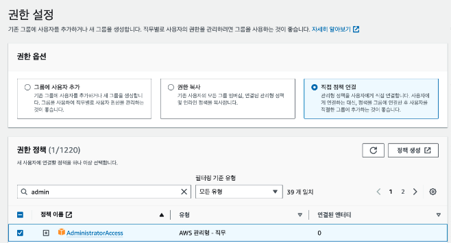 - 관리 권한(Admin Access)가진 IAM 유저 생성하기