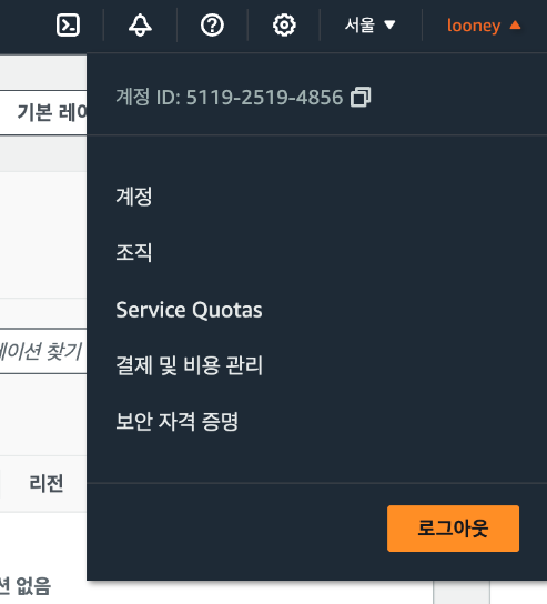 1. 오른쪽 위의 자기의 이름이 있는 곳에 보면 리전과 계정 정보가 존재