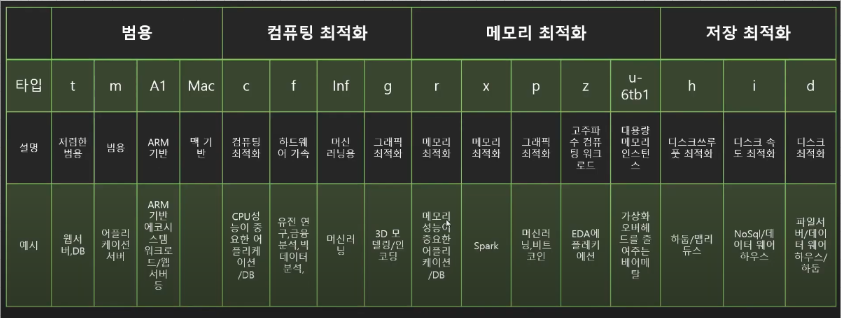 - 인스턴스의 CPU 갯수, 메모리 크기, 성능 등으로 사이즈 결정