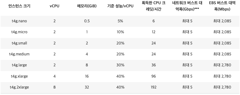 - t4g = t4인스턴스 중에 AWS Gravition 프로세서를 사용(g)