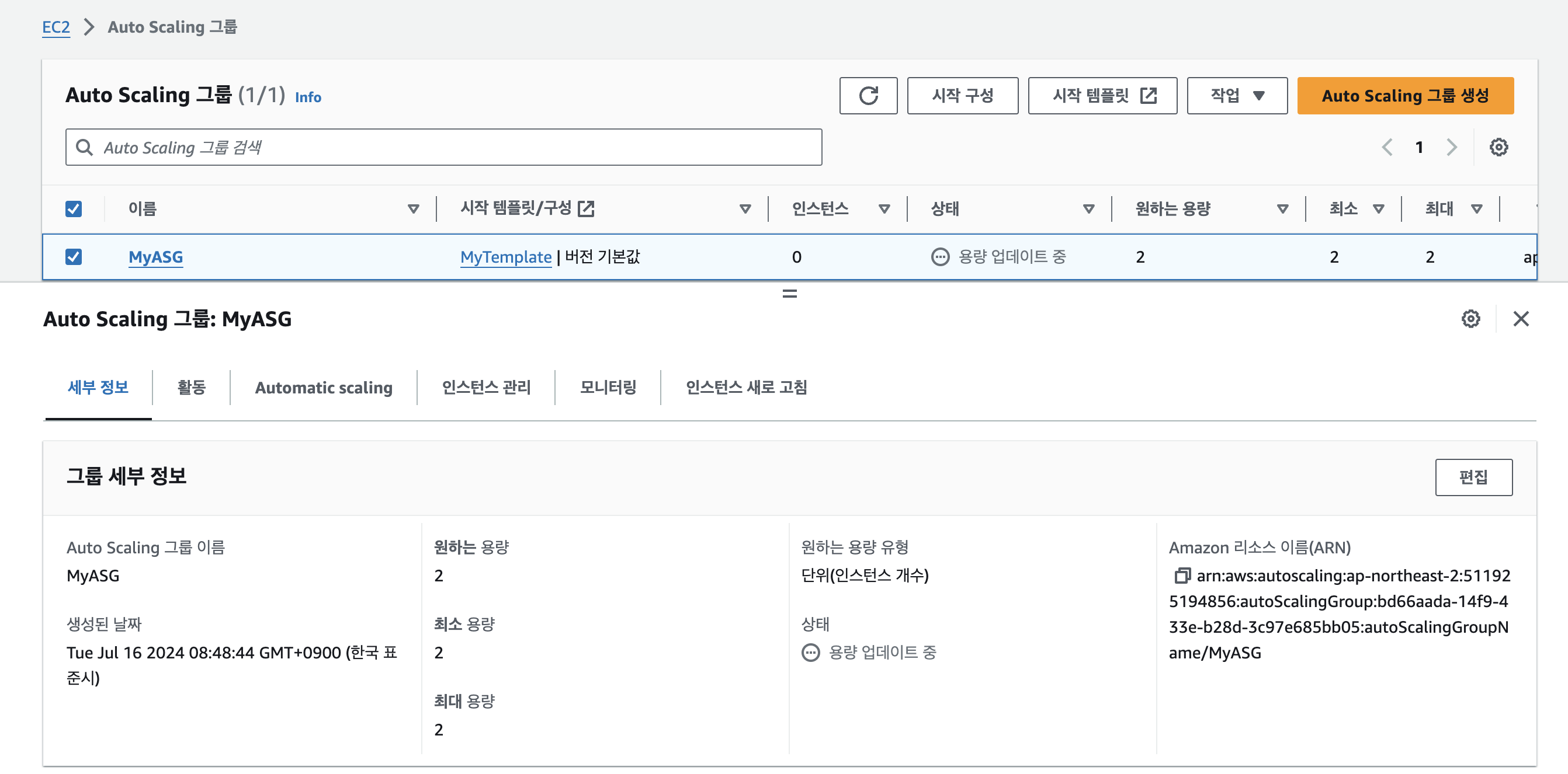시작 구성에 맞는 EC2를 auto Scaling 클러스터에 띄워줌.