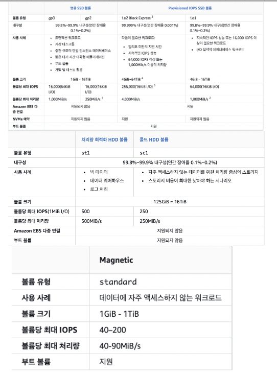 Amazon Elastic Block Store(EBS)는 AWS 클라우드의 Amazon EC2 인스턴스에 사용할 영구 블록 스토리지 볼륨을 제공합니다. 각 Amazon EBS 볼륨은 가용 영역내에 자동으로 복제되어 구성요소 장애로부터 보호해주고, 고 가용성 및 내구성을 제공합니다. Amazon EBS 볼륨은 워크로드 실행에 필요한 지연시간이 짧고 일관된 성능을 제공합니다. Amazon EBS를 사용하면 단 몇분내에 사용량을 많게 또는 적게 확장할 수 있으며, 프로비저닝한 부분에 대해서만 저렴한 비용을 지불합니다. -AWS-
