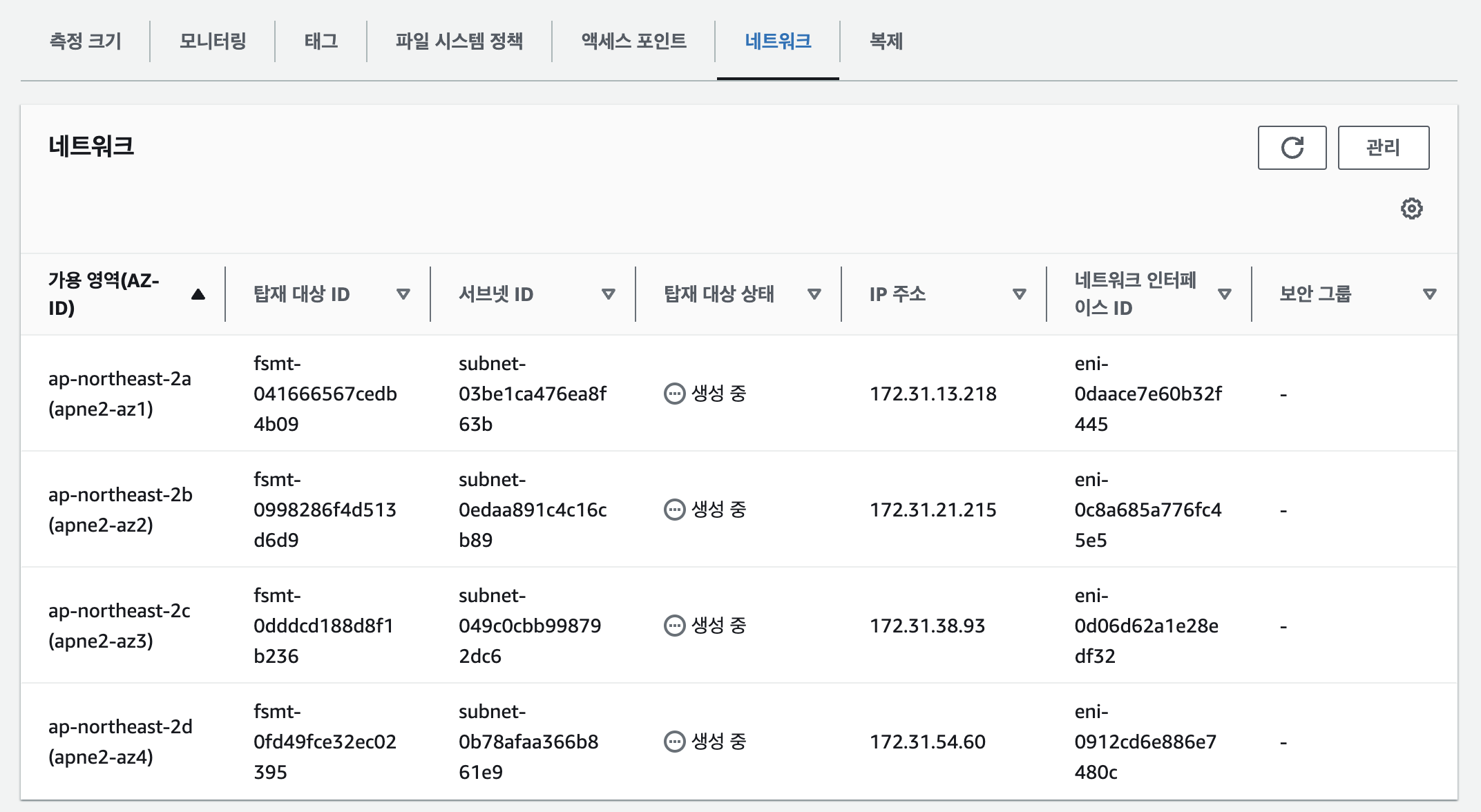 각 가용영역에 Mount Target을 두고 각각의 가용영역에 해당 Mount Target으로 접근