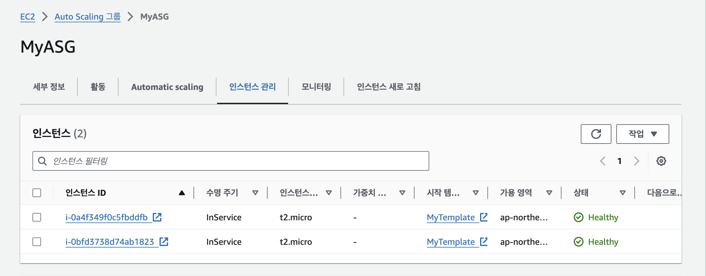 Auto Scaling 그룹 생성만들었던 시작 템플릿, 가용영역, 서브넷 선택처음 만들 인스턴스 갯수와, 최소 갯수 & 최대 갯수 선택Auto Scaling Group이 실행중Auto Scaling Group을 통해서 실행중인 인스턴스작업 기록을 통해서 확인할 수 있음