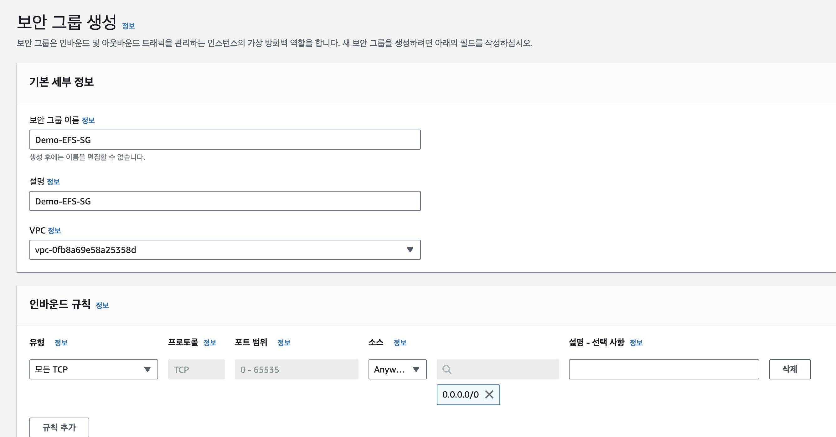 EFS One Zone: 하나의 가용영역에 보관 → 저장된 가용영역의 상황에 영향을 받을 수 있음.