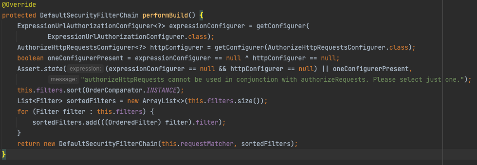 HttpSecurity.build()를 호출하면, 최종적으로 performBuild() 메서드가 실행됩니다. 이 메서드는 지금까지 설정된 모든 필터들을 종합하여 DefaultSecurityFilterChain 객체를 생성하는 핵심 단계입니다.