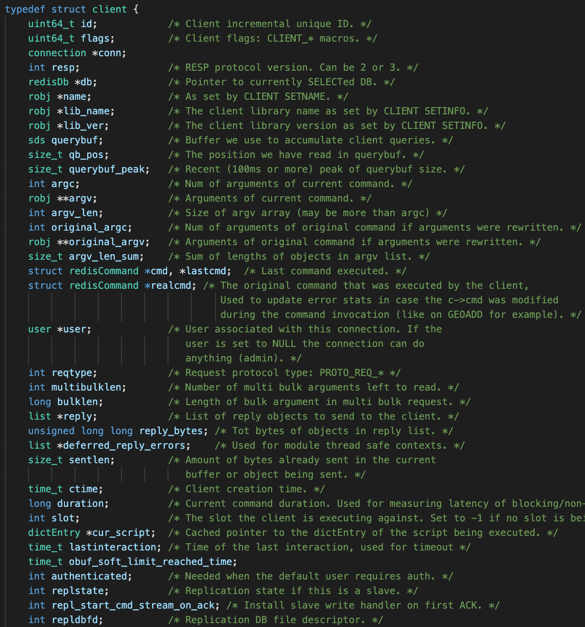 그래서 나는 querybuf를 변경하면 될 것이라 생각했고, querybuf는 client 구조체의 멤버이므로 client는 다음과 같이 이루어져 있었다.