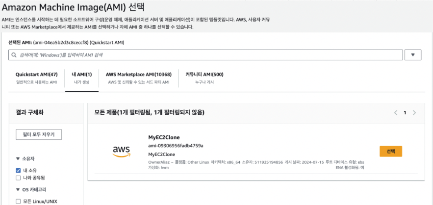 - 인스턴스 시작 -> AMI t 선택 -> MyEC2Clone