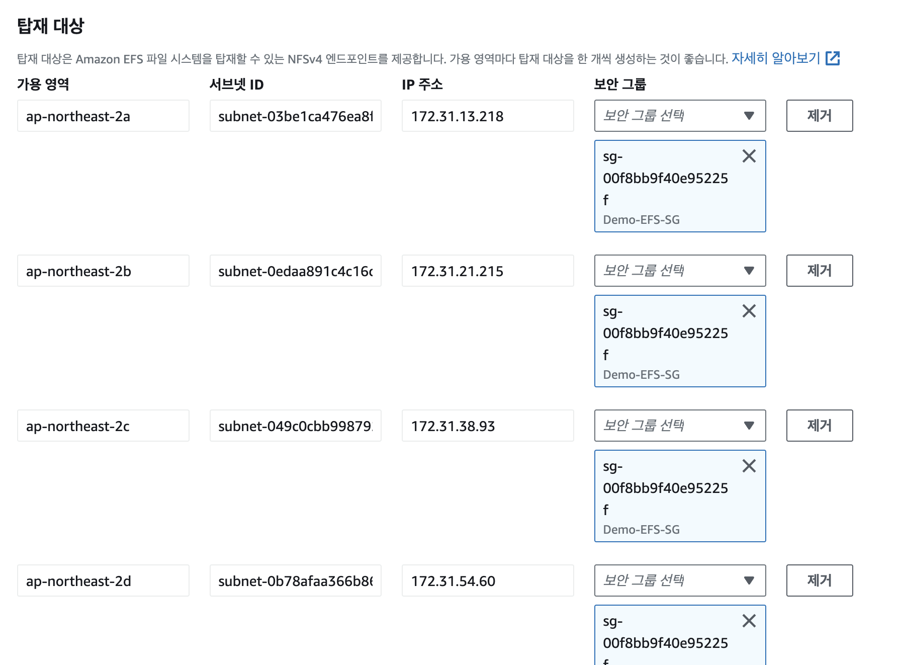 - 각 가용영역에 Mount Target을 두고 각각의 가용영역에 해당 Mount Target으로 접근